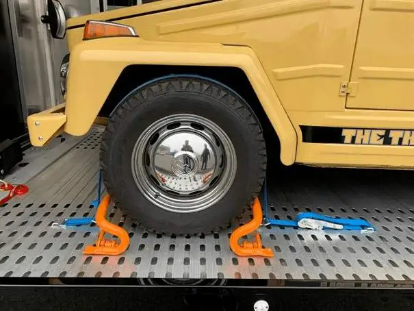 Gebruik naast de spanbanden ook de wiel aanslag beugels. ALGEMA FIT-ZEL heeft een TUV-goedkeuring op het vastzetten van auto’s met 2 spanbanden en wiel aanslag beugels.