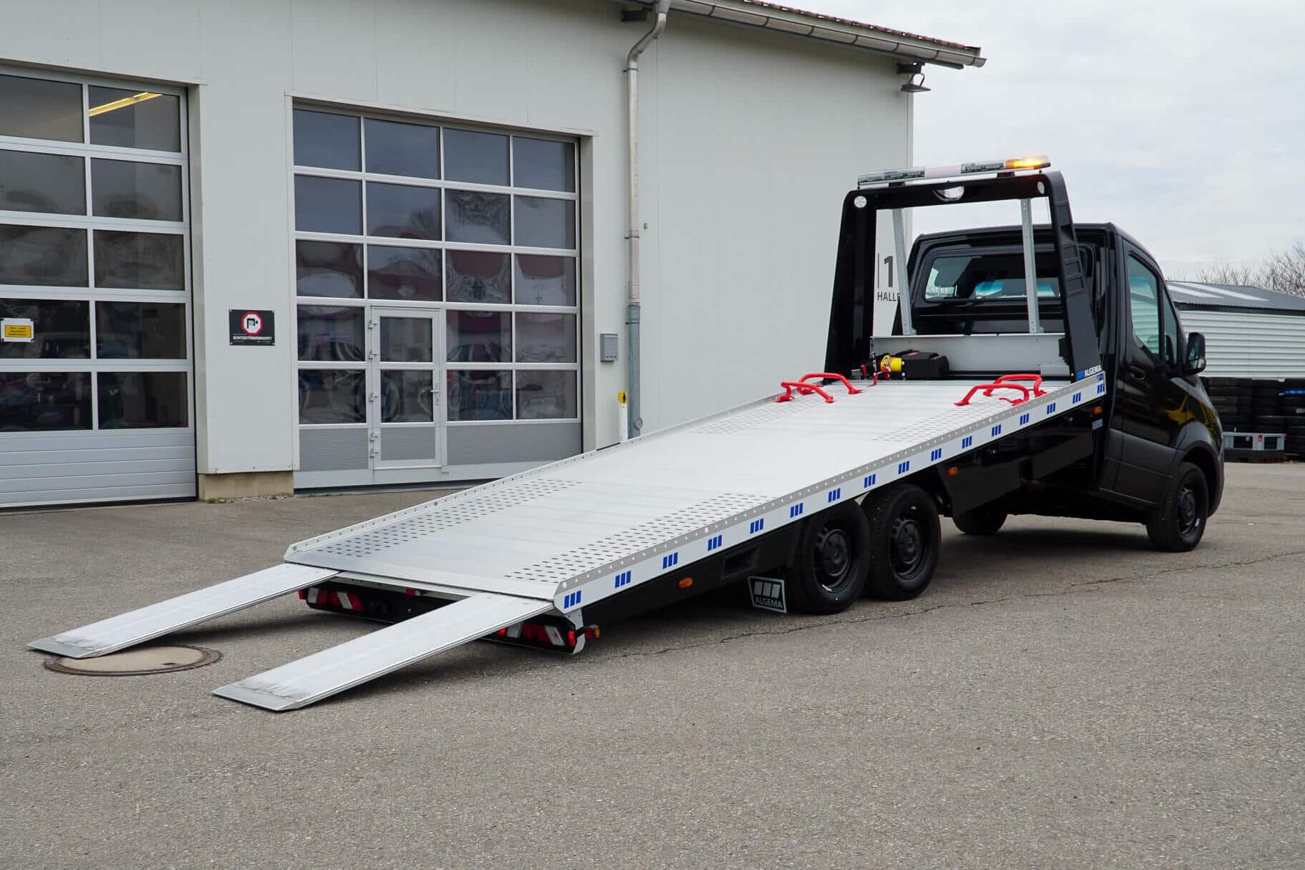 Voor het vervoer van 1 auto is de Algema Festplateau de lichtgewicht oprijwagen, ook op het Mercedes-Benz Sprinter chassis.
