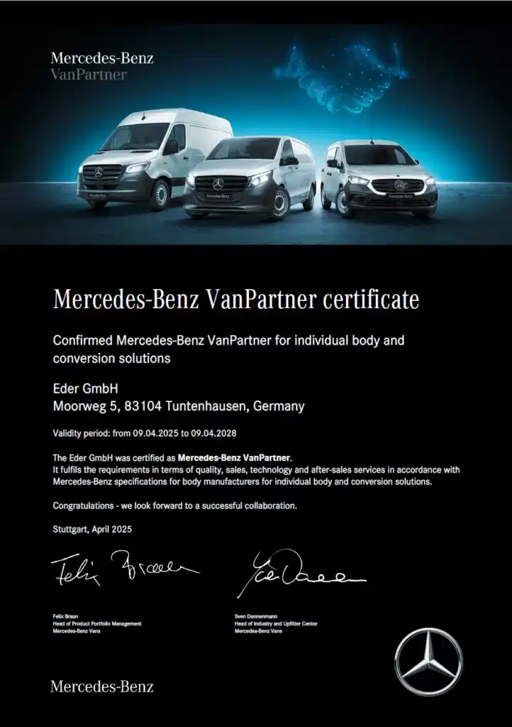 Pas na het doorlopen van een uitvoerig certificeringsproces, waarin EDER blijkt geeft van een uitgebreide expertise die ons in staat stelt ombouwwerkzaamheden uit te voeren aan de voertuigen van Mercedes, wordt die verkregen. En omdat de voertuigtechnologie voortdurend evolueert, is nascholing van de medewerkers een voortdurend proces.