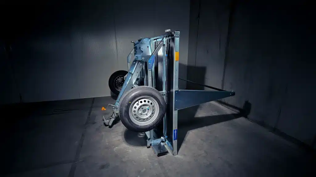 Ook de grotere TREILER 350/2 fiets-aanhangwagen kan op de achterzijde worden gestald. Daarbij is ook de beugel waarmee de fietsframes verbonden zijn, eenvoudig te demonteren.